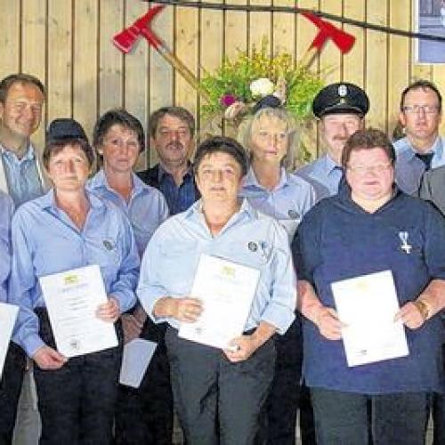 Landrat Thomas Habermann lobte die Kameradschaft in der Schönauer Wehr. Er sei immer wieder gerne Gast in der Brendtalgemeinde, denn die Feste hätten einen herzlichen, familiären Charakter. Er zeichnete für 25-jährigen Dienst in der Schönauer Wehr mit dem staatlichen Feuerwehrehrenzeichen in Silber die Wehrmänner Axel Vey, Ewald Johannes und Gerhard Kleinhenz aus. Ebenfalls vor 25 Jahren war unter der damaligen Führung von Rudi Zehe als Kommandant und jetzigen Bürgermeisters eine Damenwehrgruppe gegründet worden. Monika Reubelt, Doris Müller, Maria Mangold, Karola Beck, Theresia Stäblein, Theresia Deget, Ingrid Zehe und Jutta Vey nahmen ebenfalls freudestrahlend Urkunde und Ehrenzeichen in Silber entgegen. Sogar seit 40 Jahren absolviert Adolf Nußmann den treuen Dienst als aktiver Wehrmann. Ihm wurde von Landrat Habermann das goldene Ehrenzeichen an die Brust geheftet.