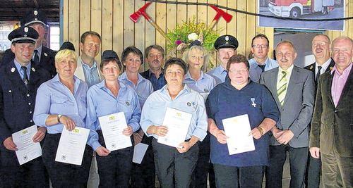 Treu zur Feuerwehr: Für langjährigen aktiven Dienst in der Wehr zeichnete Landrat Thomas Habermann (rechts) Jubilare mit dem Feuerwehrehrenzeichen aus. Das Bild zeigt (von links): Kommandant Ewald Johannes (25 Jahre), Feuerwehrvereinsvorsitzenden Alexander Keß, Ingrid Zehe (25 Jahre), Schirmherr Bernd Weiß, Doris Müller, Jutta Vey (beide 25 Jahre), Adolf Nußmann (40 Jahre), Theresia Deget, Karola Beck, Axel Vey, Monika Reubelt, Gerhard Kleinhenz (25 Jahre), Bürgermeister Rudi Zehe und Kreisbrandrat Peter Bulheller.