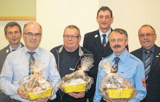 Für 40-jährige Mitgliedschaft im Feuerwehrverein wurden durch den Vereinsvorsitzenden Alexander Keß und Bürgermeister Rudi Zehe Walter Beck, Wilfried Deget, Manfred Rehm und Albert Stäblein geehrt.